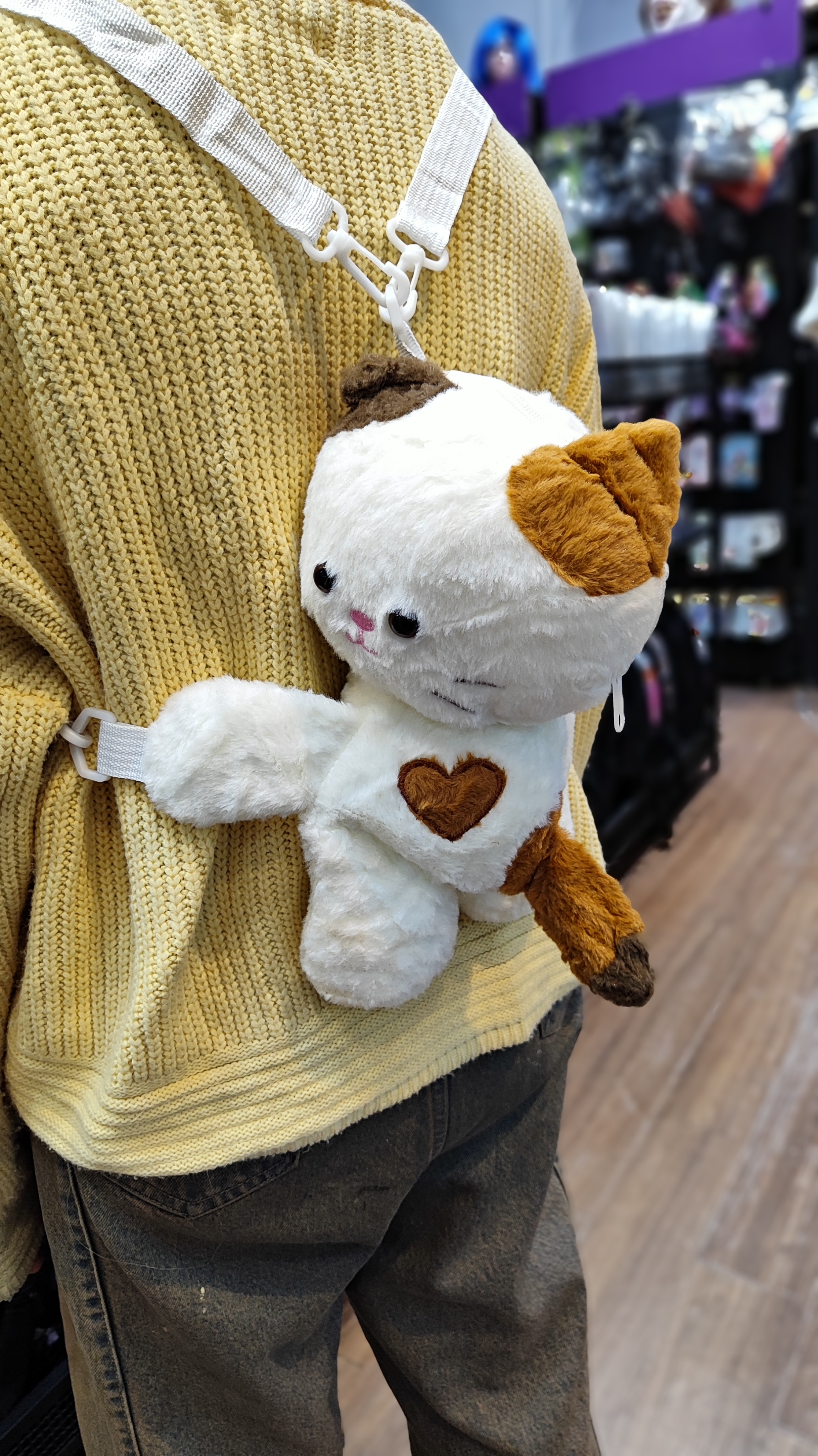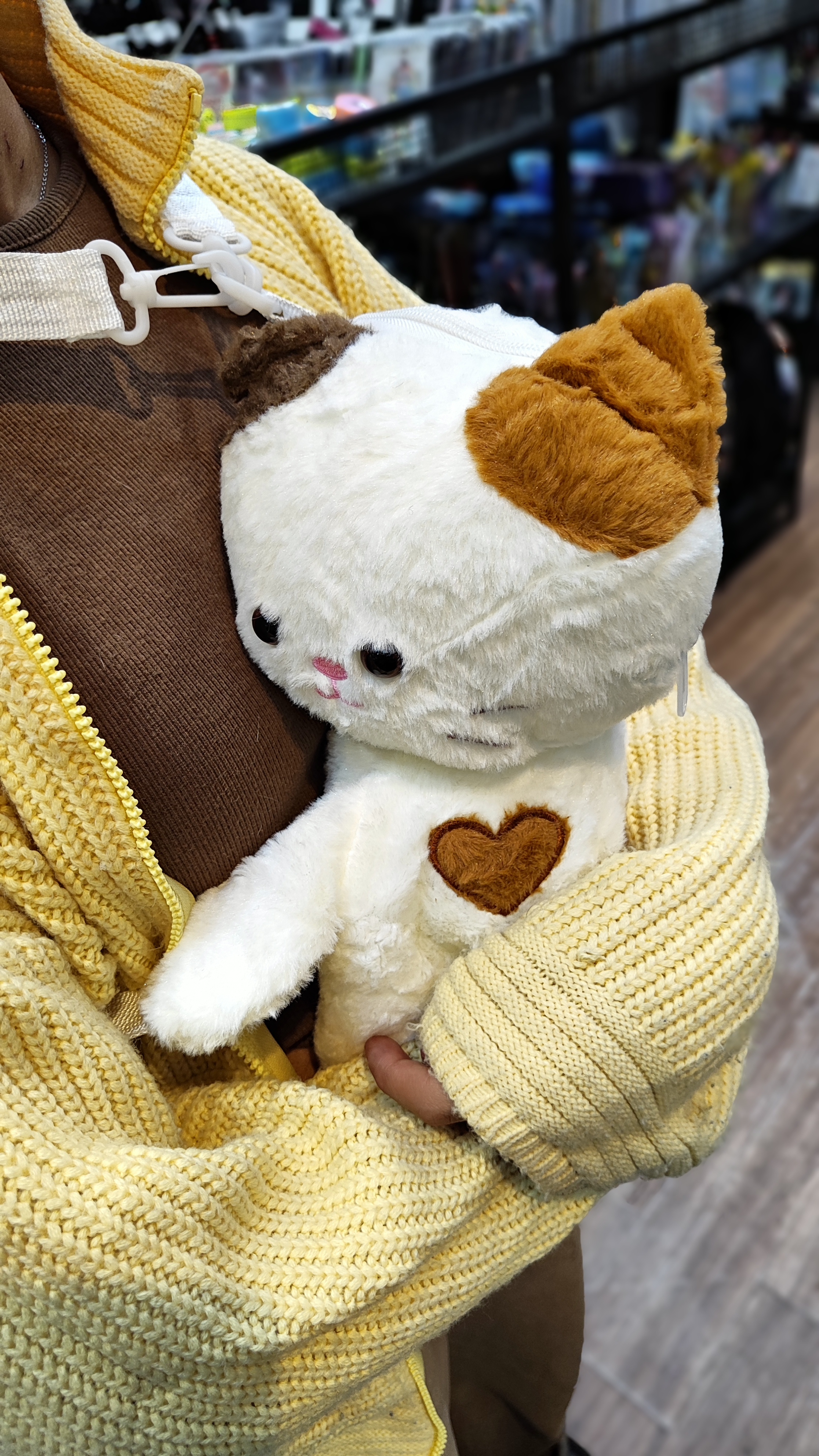 یه گربهی بامزه و باحال با یه قلب کوچولوی روی سینهاش که کیف رو محکم بغل کرده و انگار نمیخواد ازت جدا بشه 💕